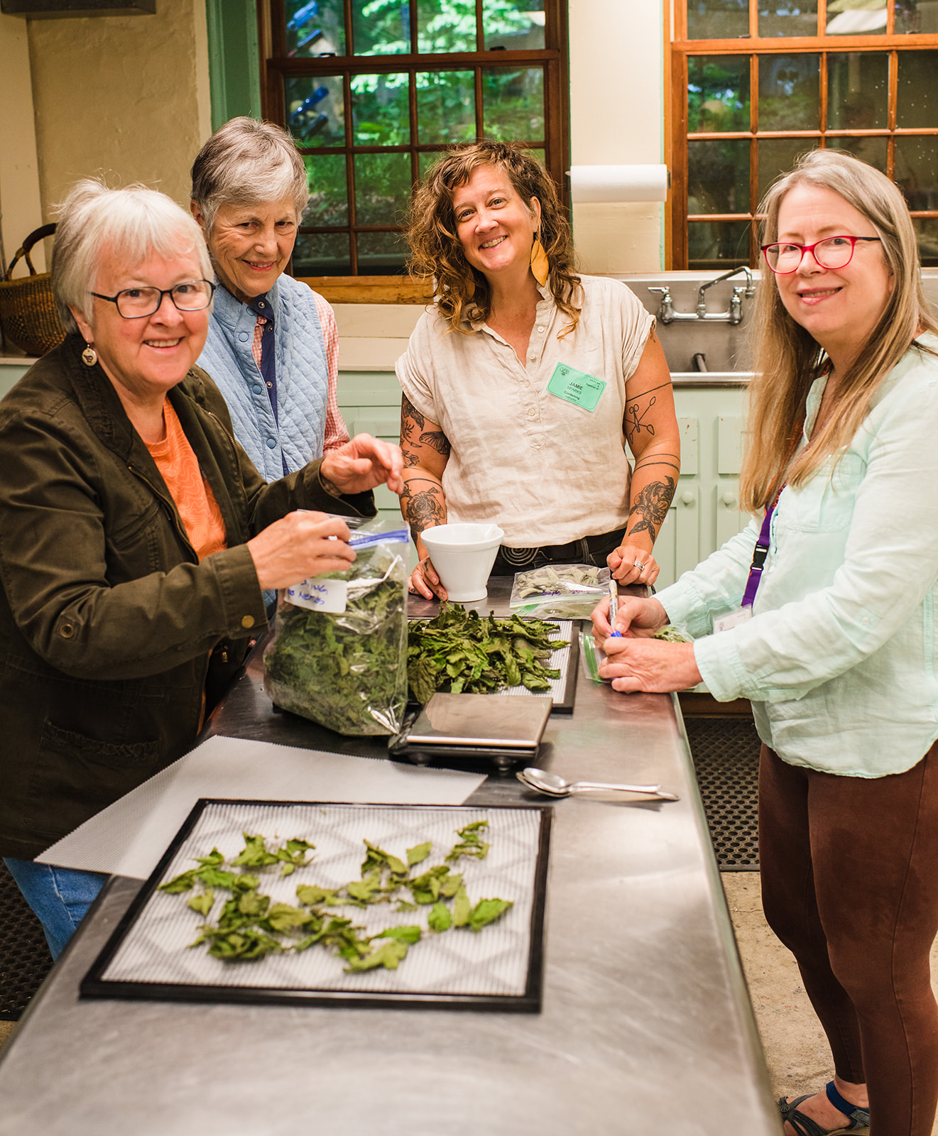 Jamie: Our days are quite varied. We often spend time in the garden on a foraging hike, talking about plants and harvesting. We spend part of the day in a lecture about the benefits of many herbs and plants, and we enjoy a lot of time in the gorgeous cooking studio preparing everything from salves, to herbal salts to soups and more. And, we of course, eat.