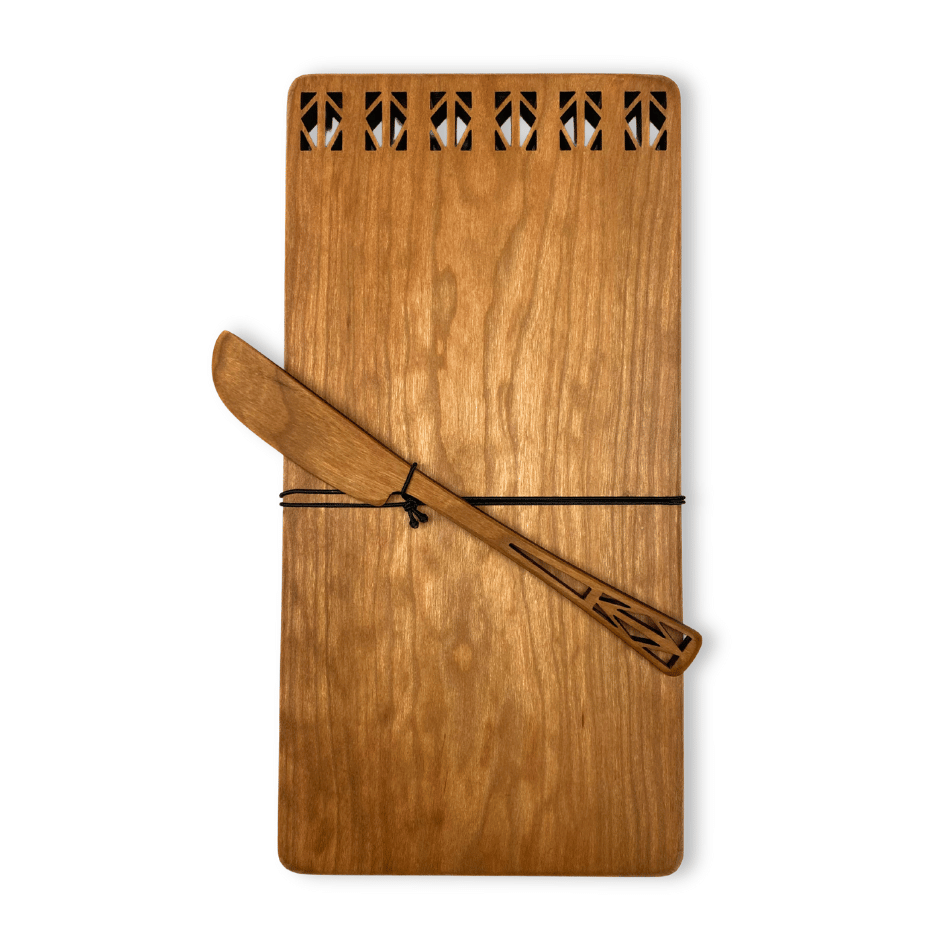 Crafted from cherry wood by Moonspoon, the board is 10 inches long by 5 inches wide and is accompanied by a cherry wood spreader.