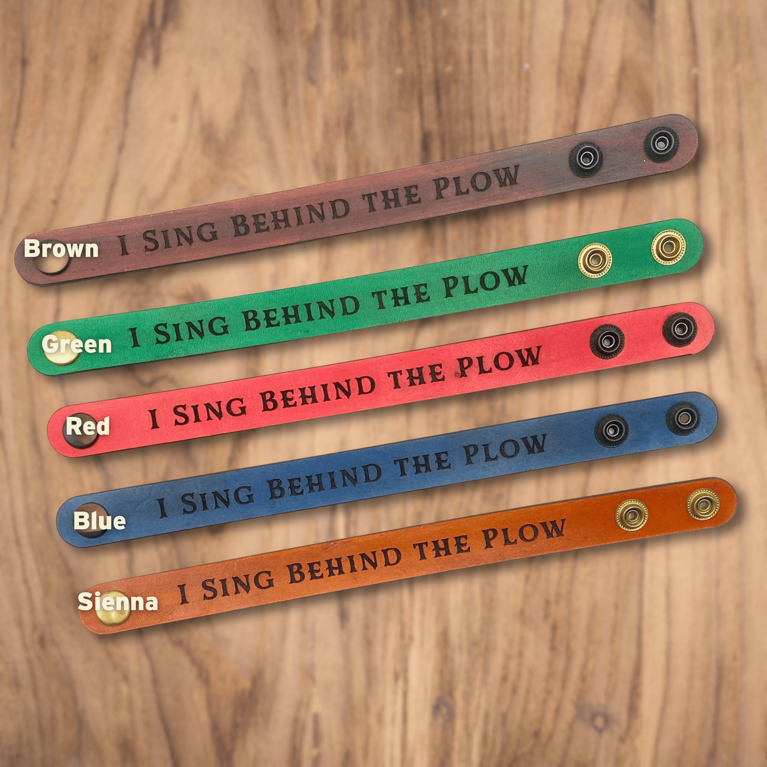 Made by artist Cameron Plunkett, this high quality leather bracelet is engraved with the motto “I Sing Behind the Plow”. Hardware metal may vary.
