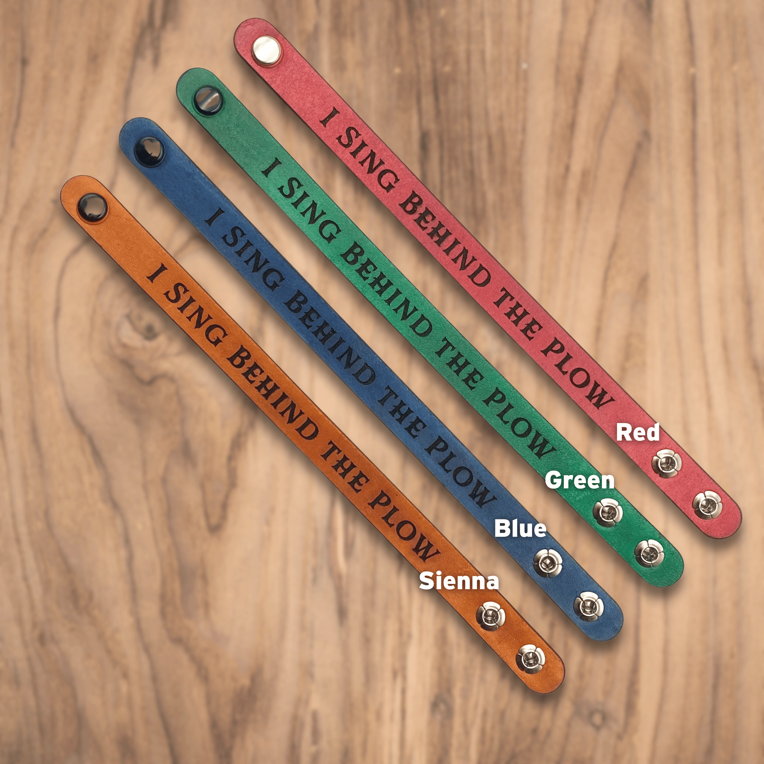 Made by artist Cameron Plunkett, this high quality leather bracelet is engraved with our motto “We Sing Behind the Plow”. Hardware metal may vary.